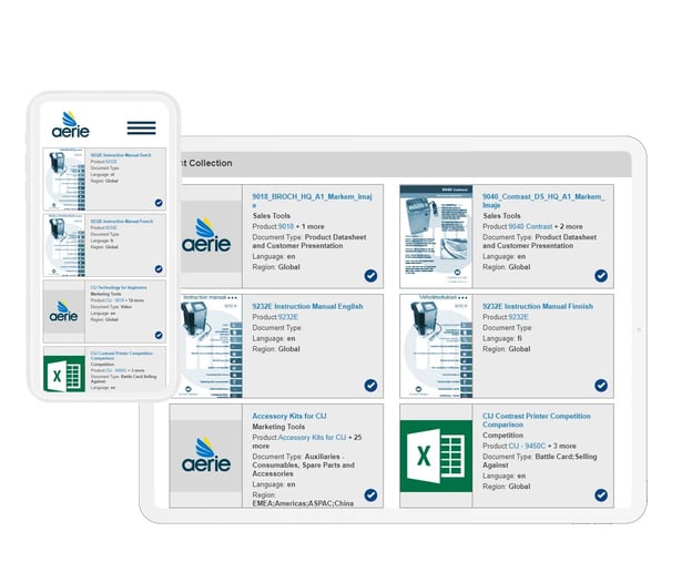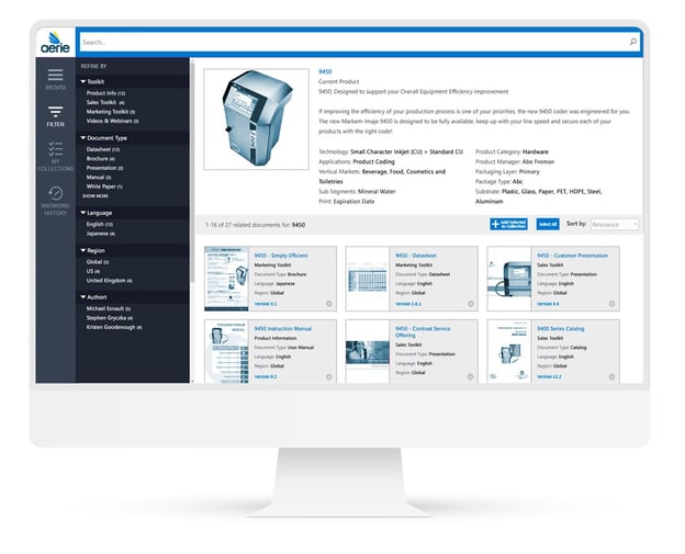 In this example, you see all of the marketing material for a manufacturing company, so everyone on the sales team can find product information using this search interface. You can quickly and easily find all information and documents associated with each product, along with the version history of each document. The gray checkbox on the corner of each card adds it to your “collections,” making an instant shortcut to any document.
